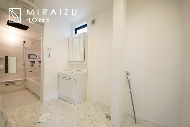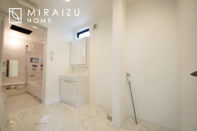 洗濯機置き場と脱衣スペースもしっかりと確保されている洗面室、洗面コーナーは、窓から陽も差し明るく開放的な造りです。家事導線も良いので洗濯物やお湯はりもストレスフリーに毎日家事を楽しめそうです。
