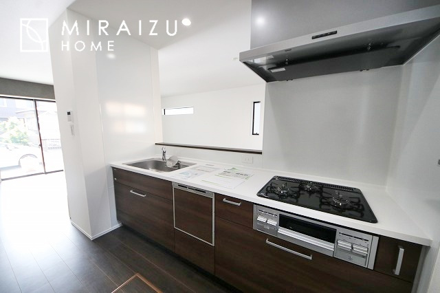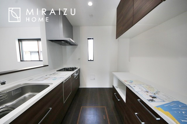 スッキリとした形が上品な広々ワイドキッチンです。レンジフードもすっきりとした造りなので圧迫感もございません。窓もあり明るい空間の中で毎日お料理することが可能です。収納スペースも広いのが嬉しいですね。