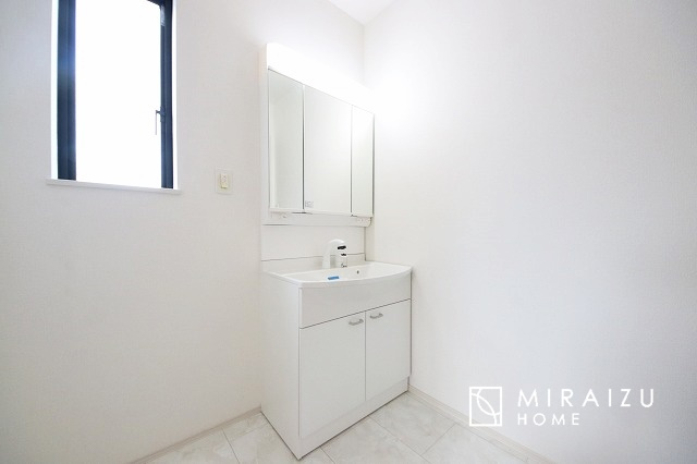洗濯機置き場、脱衣スペースもしっかりと確保されている洗面室。 水回りが集結した間取りなので、お料理やお洗濯物、お掃除の同時進行も可能です。
