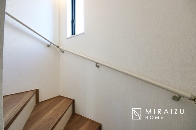 安全性に配慮した手すり、清潔感や明るい陽光を取り入れてくれる窓がある階段。LED照明付きでお財布にもやさしいつくり。