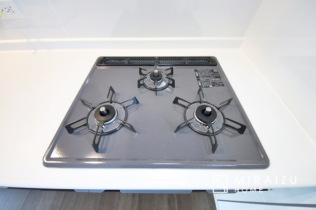 広々としたキッチンは大きな深型シンク、3口コンロ、換気扇、大きなお鍋から小物まで取り出しやすさを考えられた引き出し収納の付いたシステムキッチンです。