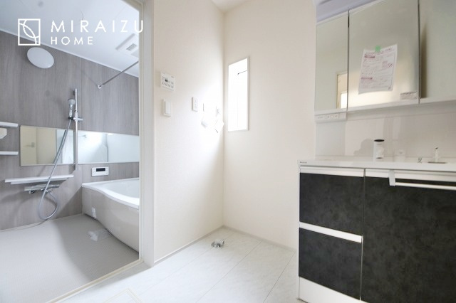 洗濯機置き場と脱衣スペースもしっかりと確保されている洗面室、洗面コーナーは、窓から陽も差し明るく開放的な造りです。家事導線も良いので洗濯物やお湯はりもストレスフリーに毎日家事を楽しめそうです。