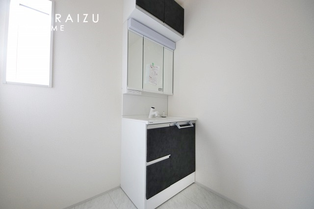 高級感漂う洗面台です。鏡の後ろの収納棚もとても充実しております。コスメが大好きな奥様も、女子力高いご主人様もきっとご満足いただける収納力です。三面鏡なので、ヘアセットにも便利です。