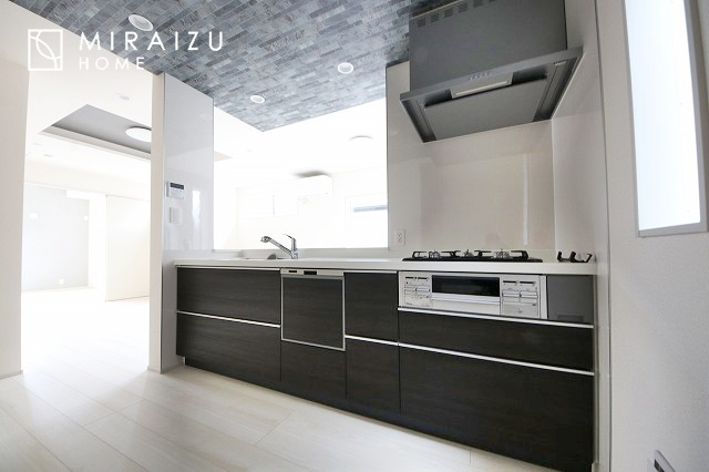 洗練されたキッチンでは毎日の家事を少しでも楽に快適に工夫したいですね、大きいシンクではお皿洗いもストレスフリー、3口コンロでは要領よくお料理も可能です。レンジフードもお掃除がしやすい設計が嬉しい。
