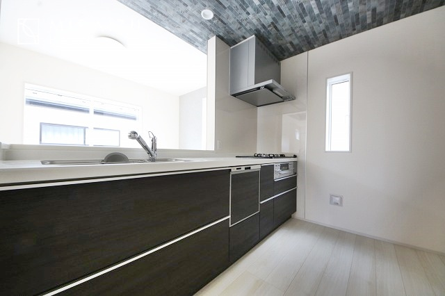 スッキリとした形が上品な広々ワイドキッチンです。レンジフードもすっきりとした造りなので圧迫感もございません。窓もあり明るい空間の中で毎日お料理することが可能です。収納スペースも広いのが嬉しいですね。
