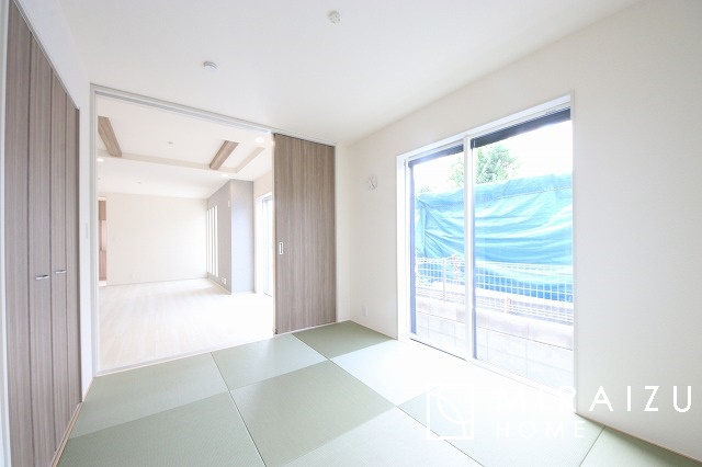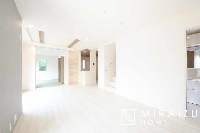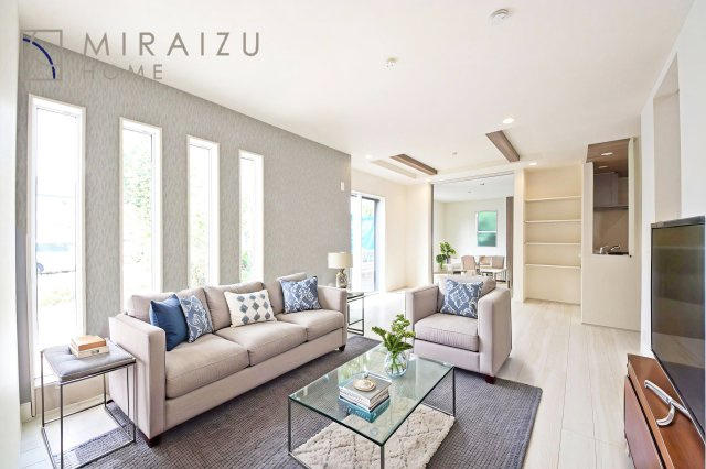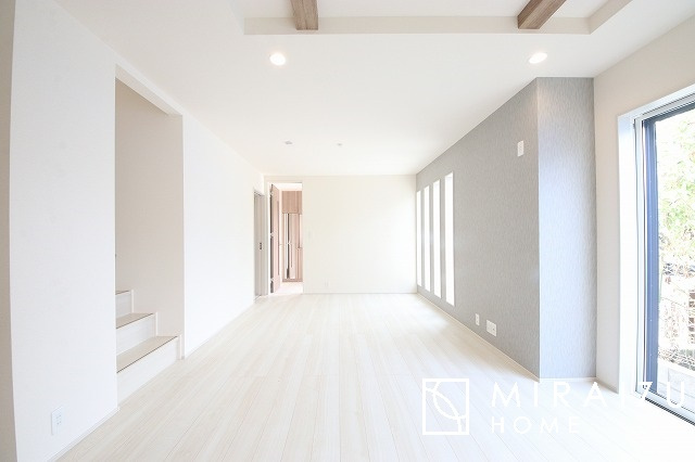 大きな窓が特徴の南向きリビングでは、太陽光も沢山取り込むことが出来てお家の中にいても日光浴が可能ですね、開放的な空間です。インテリア選びも楽しそう、ご家族様で相談しながらインテリア配置も楽しみたいです