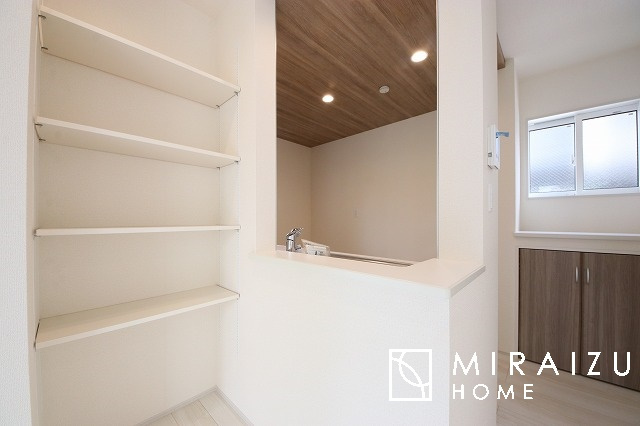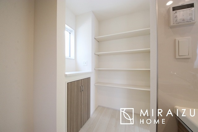 洗濯機置き場と脱衣スペースもしっかりと確保されている洗面室、洗面コーナーは、窓から陽も差し明るく開放的な造りです。家事導線も良いので洗濯物やお湯はりもストレスフリーに毎日家事を楽しめそうです。