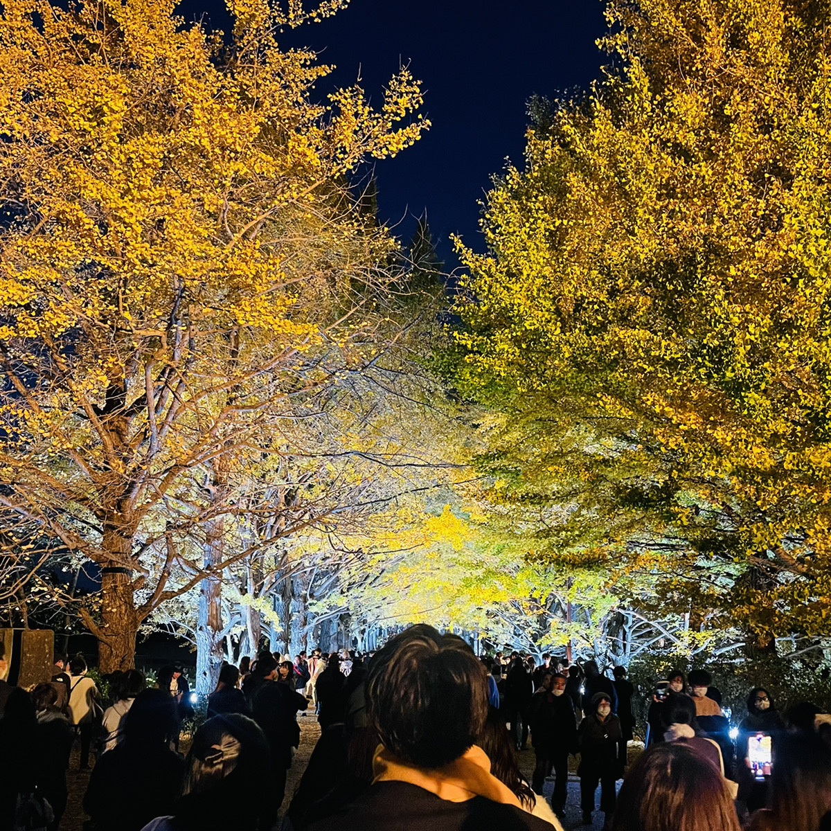 見頃のイチョウが綺麗にライトアップされ