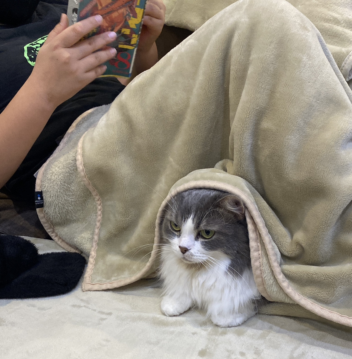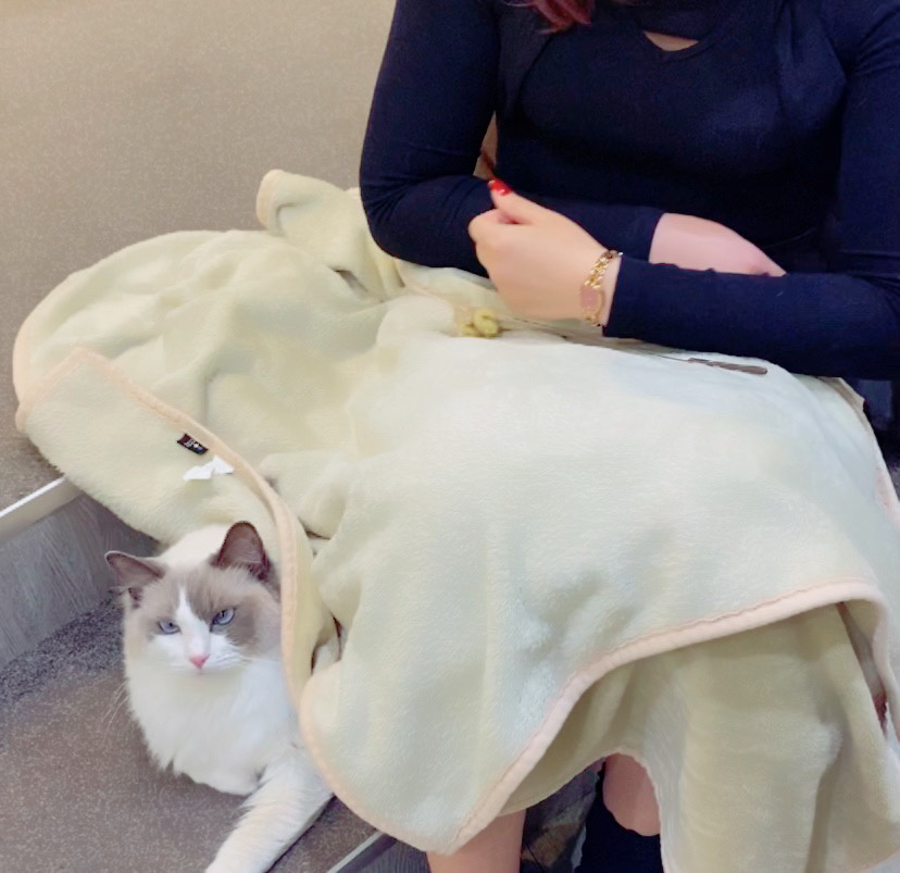 体育すわりをして毛布を掛けていると、