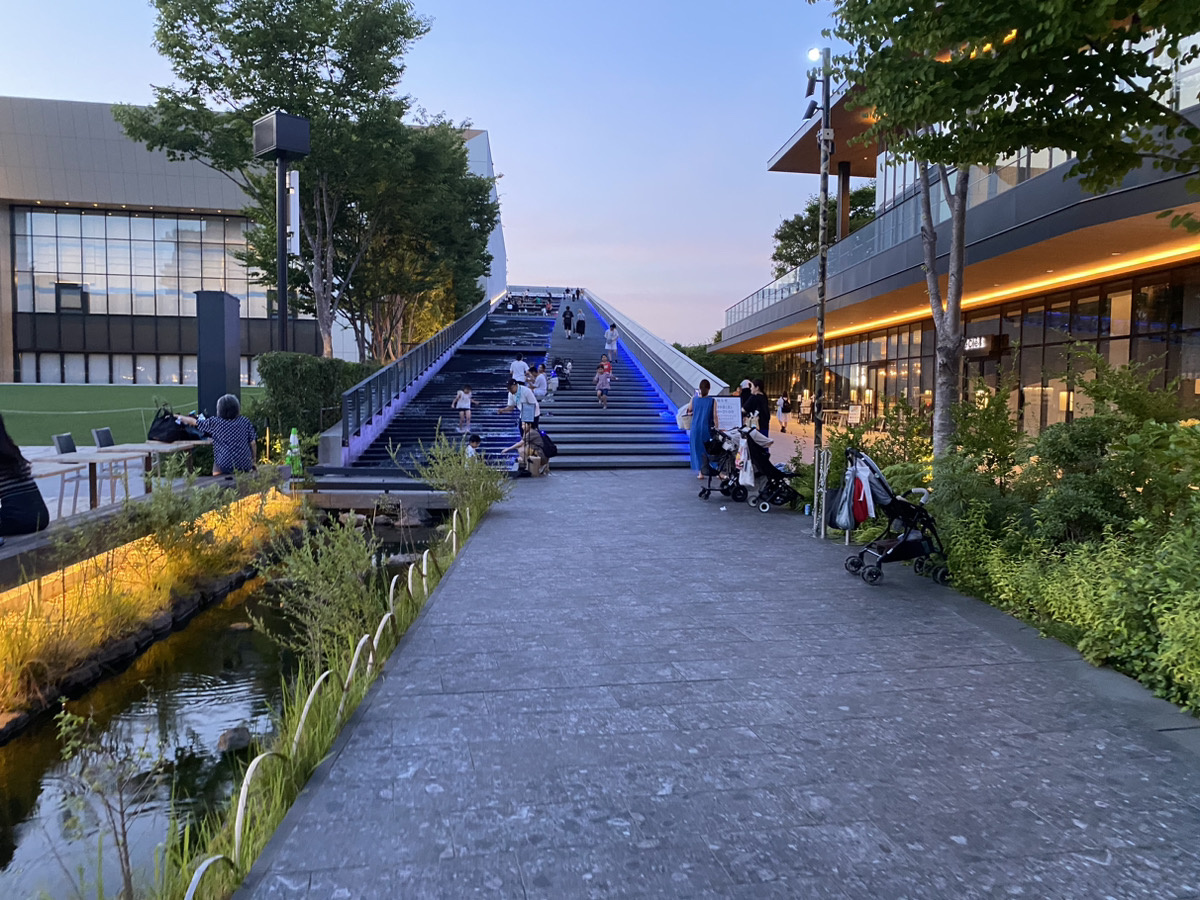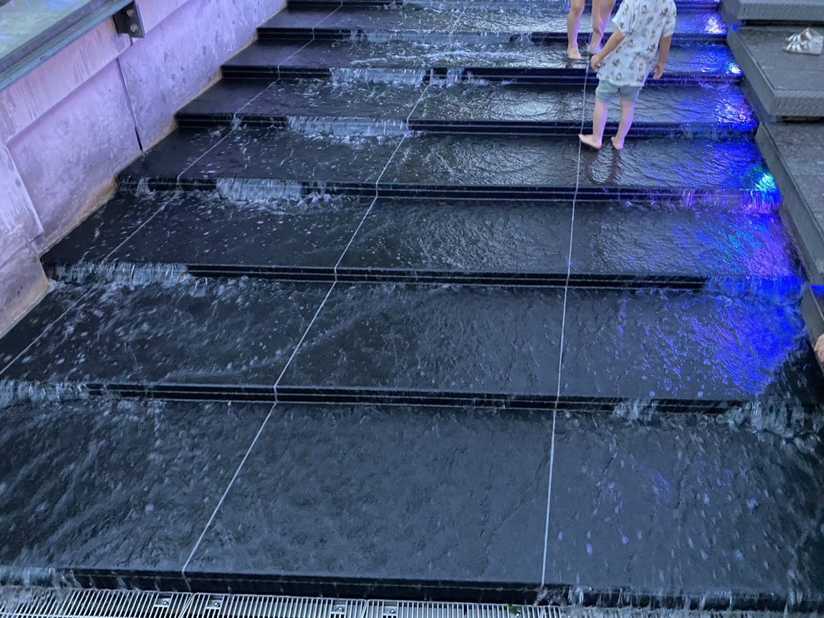 奥に見えるのが階段ですが、ただの階段ではなく、足で涼を感じられるお子様のプールのような??スポットになっております。